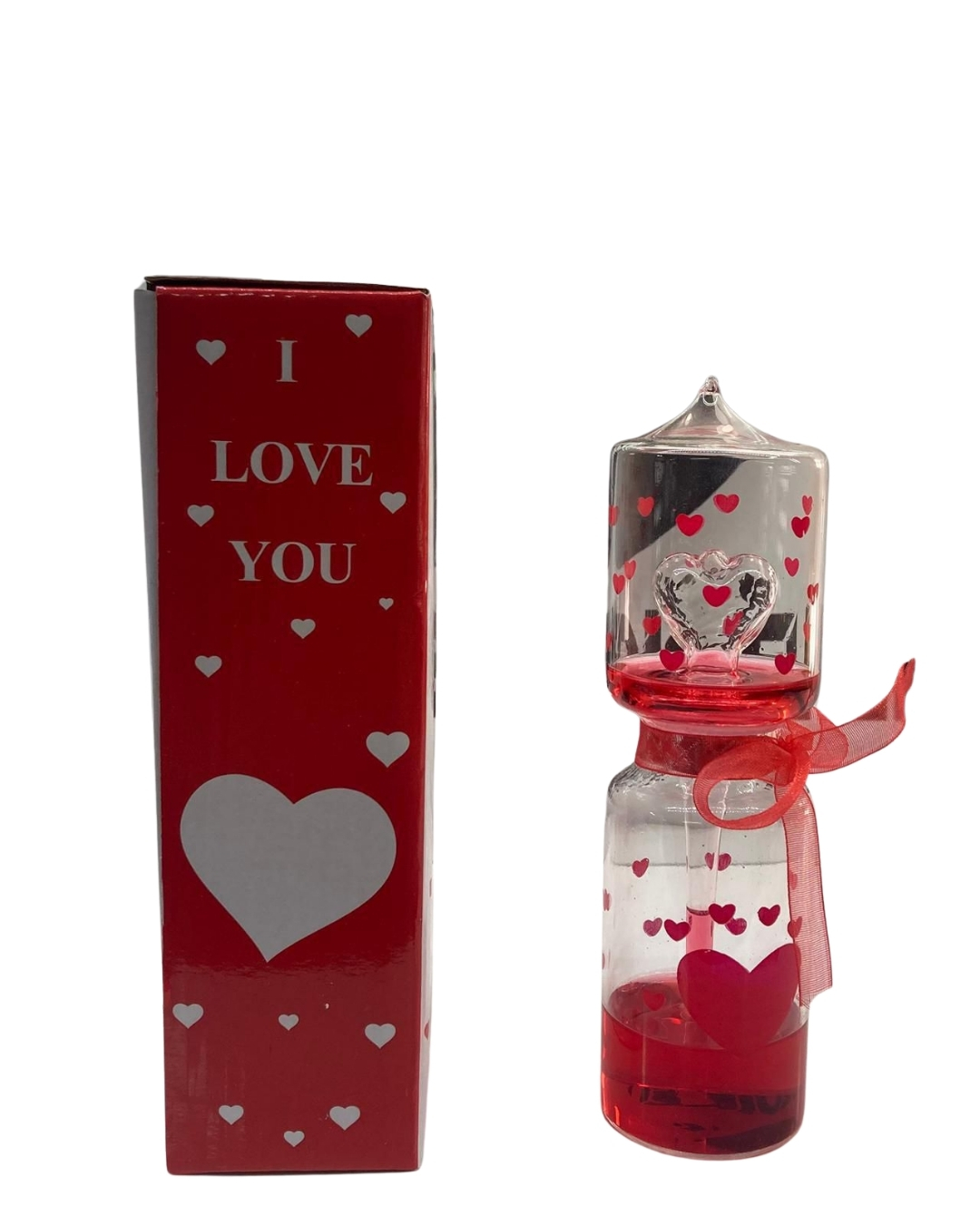 Estetik Tasarım: Kalp figürleri ve zarif kırmızı şeritlerle süslenmiş cam gövdesiyle dekoratif bir görünüme sahiptir.