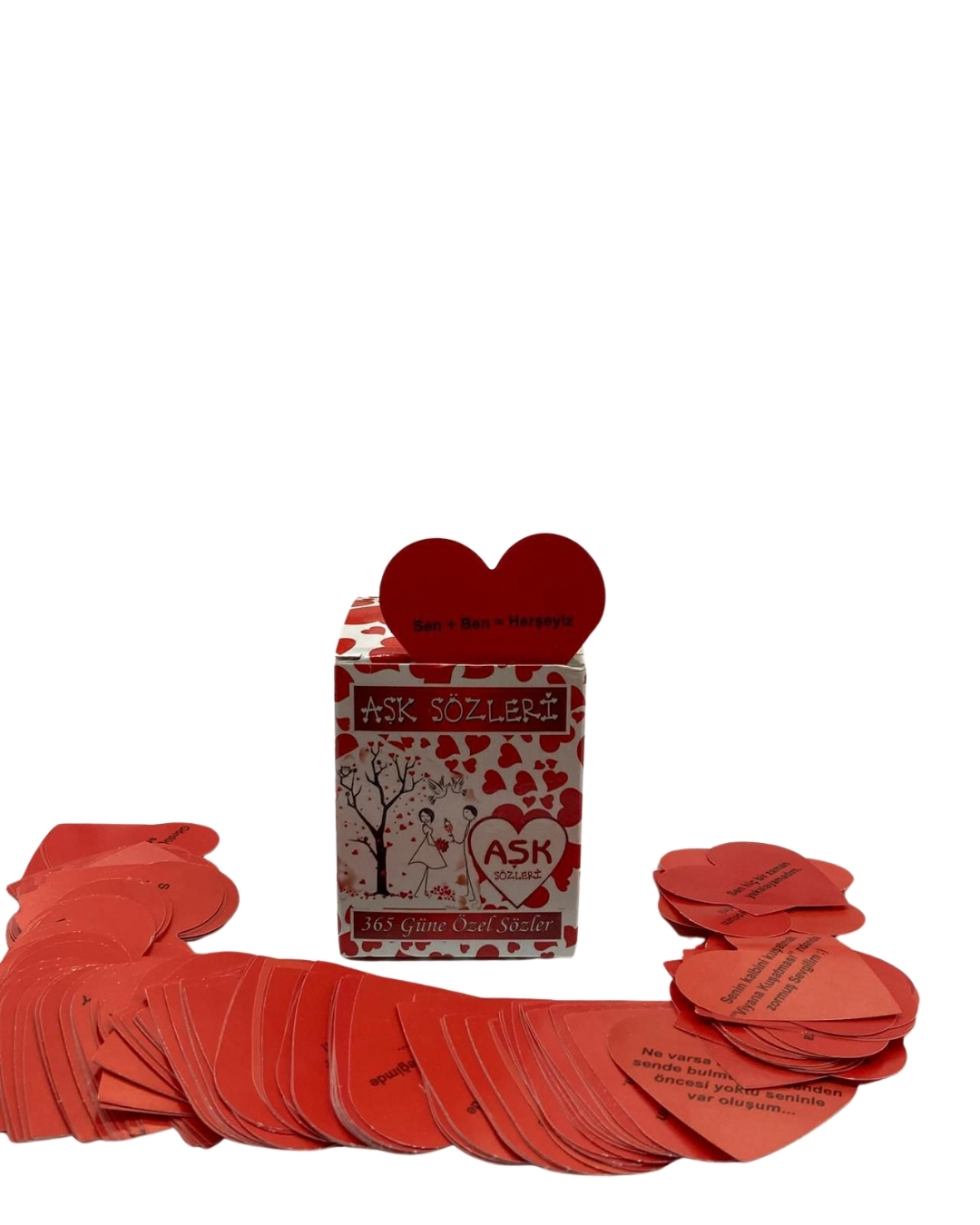 365 Adet Kalpli Kart: Yılın her günü için özenle seçilmiş, duygusal ve anlamlı aşk sözleri içeren kırmızı kalp şeklinde kartlar.