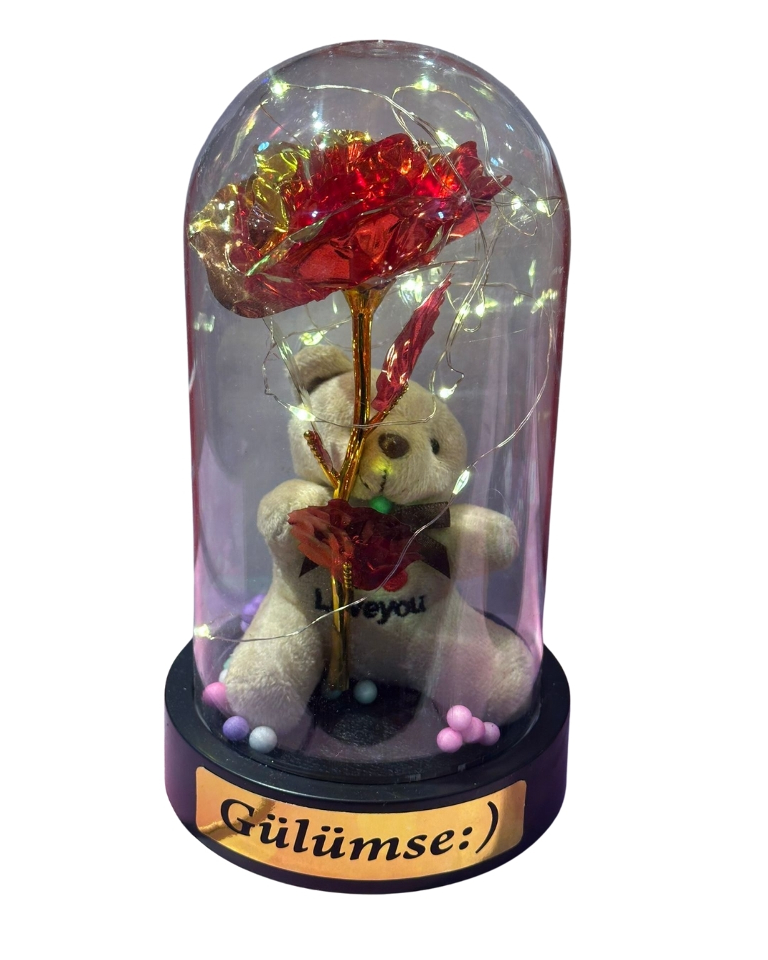 Sevginizi ifade etmenin en ışıltılı yolu! Bu özel tasarım cam fanus teraryumlar, romantik detayları ve sıcak ışıklarıyla sevdiklerinizin kalbini fethedecek. İster klasik bir kırmızı gül, ister sevimli bir peluş ayıcık veya şans getiren bir gnome (cüce) figürü; her zevke uygun bir model bu koleksiyonda sizi bekliyor.