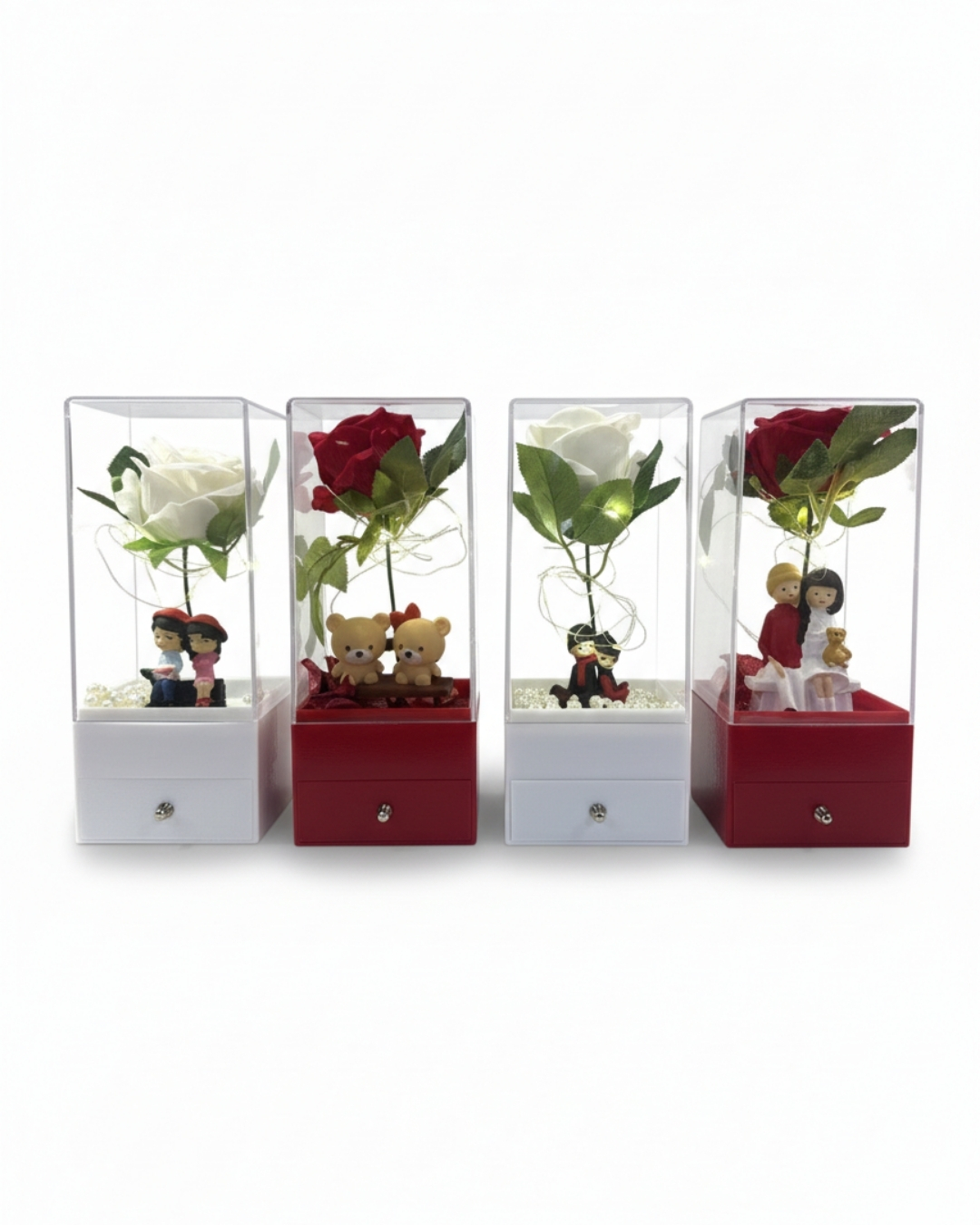 Işıltılı yapay gülün altında yer alan romantik aşıklar ve sevimli ayıcık bibloları, bu seti sadece bir takı kutusu değil, aynı zamanda büyüleyici bir gece lambası ve dekoratif bir obje haline getiriyor. Doğum günü, evlilik teklifi, yıl dönümü veya Sevgililer Günü için sevginizi taçlandıracak eşsiz bir tercih.