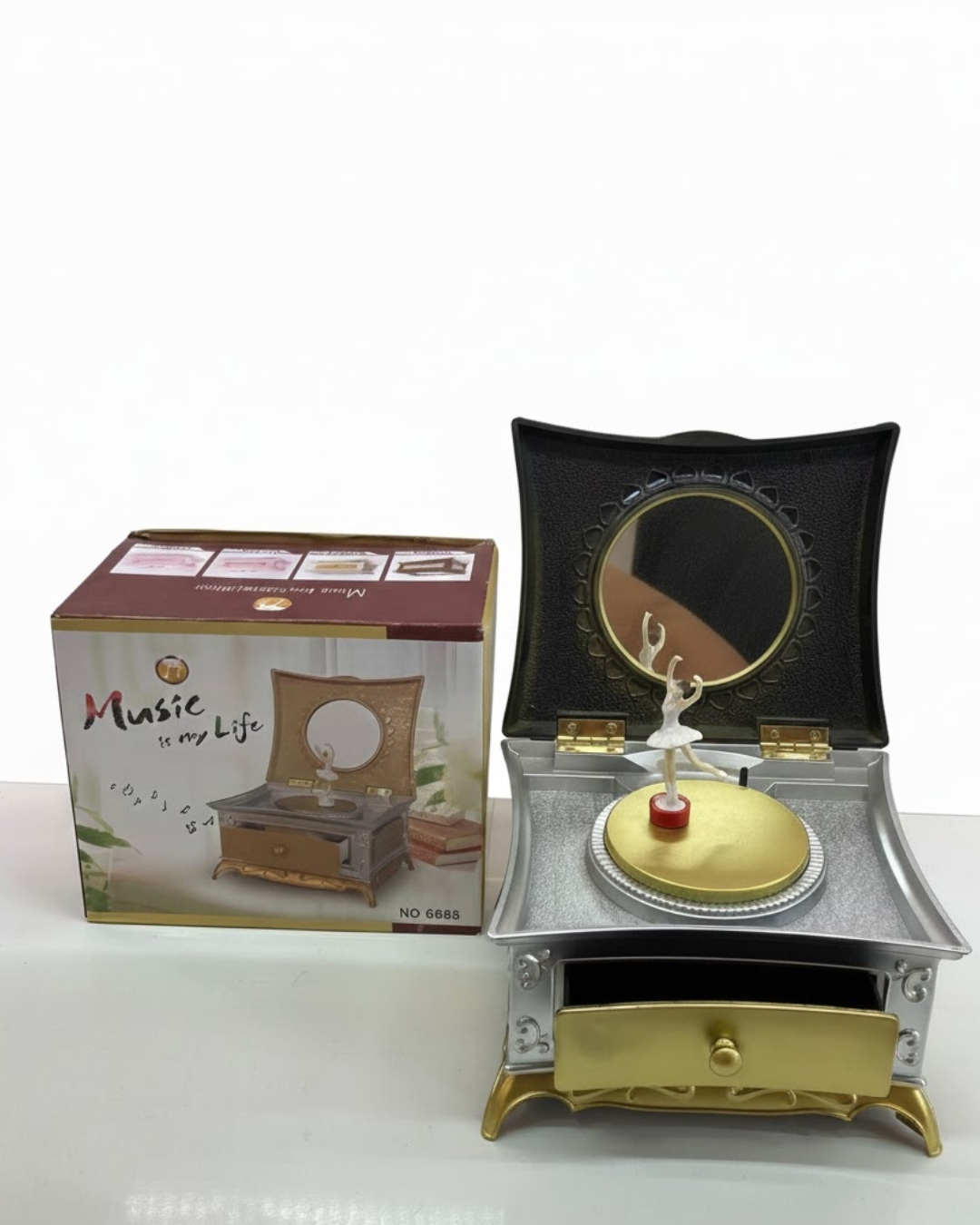 Çocukluk anılarımızın vazgeçilmezi olan balerinli müzik kutusu, modern ve şık tasarımıyla geri dönüyor. Altın ve gümüş renk detaylarıyla süslenmiş bu özel kutu, sadece bir müzik kutusu değil, aynı zamanda değerli eşyalarınızı saklayabileceğiniz dekoratif bir takı kutusudur.