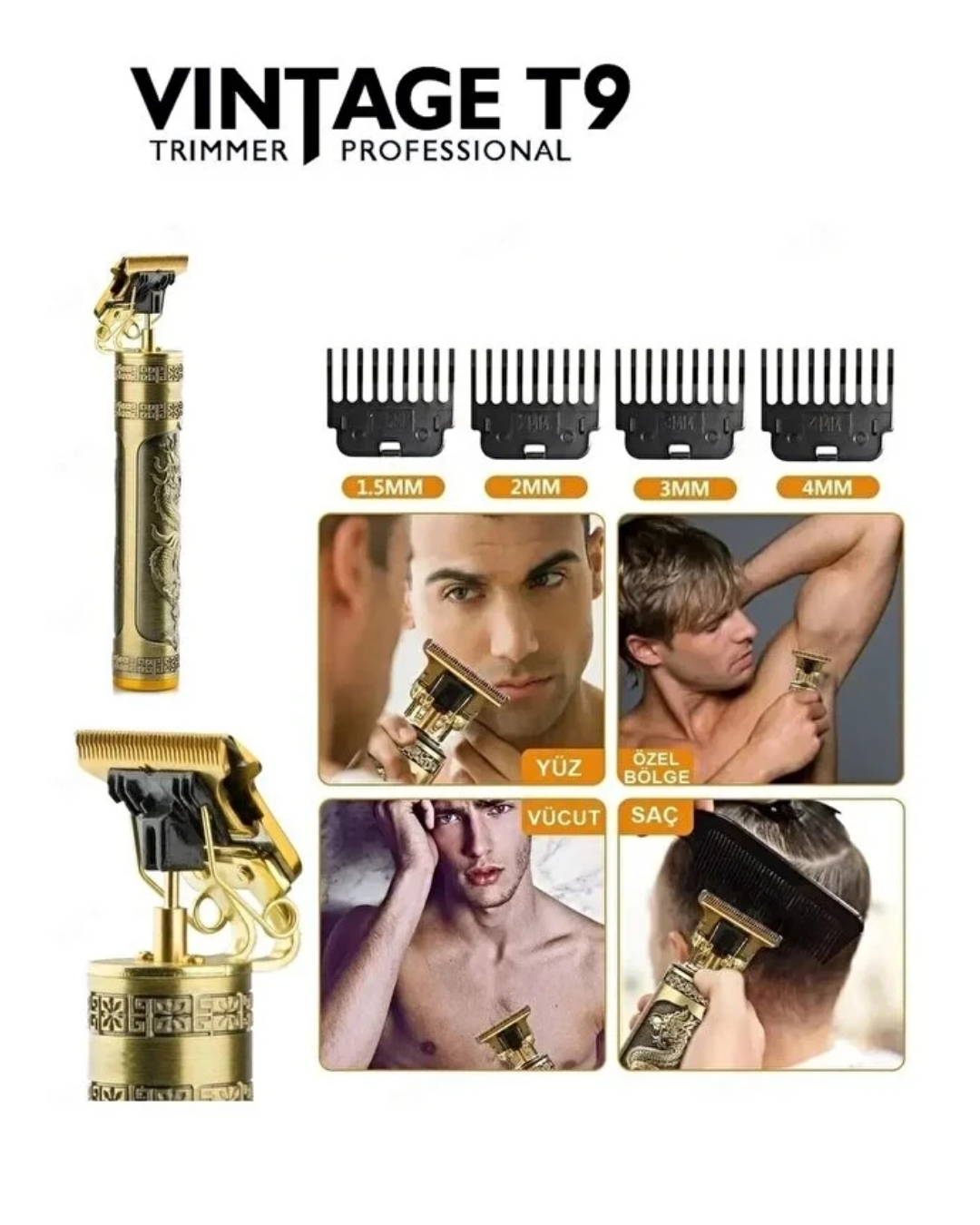 Vintage T9 Profesyonel Şarjlı Saç ve Sakal Kesme Makinesi, güçlü motoru ve paslanmaz çelik bıçaklarıyla kusursuz bir kesim performansı sunar. Özel tasarımlı metal gövdesi, dayanıklılığı ve vintage görünümüyle dikkat çeker.