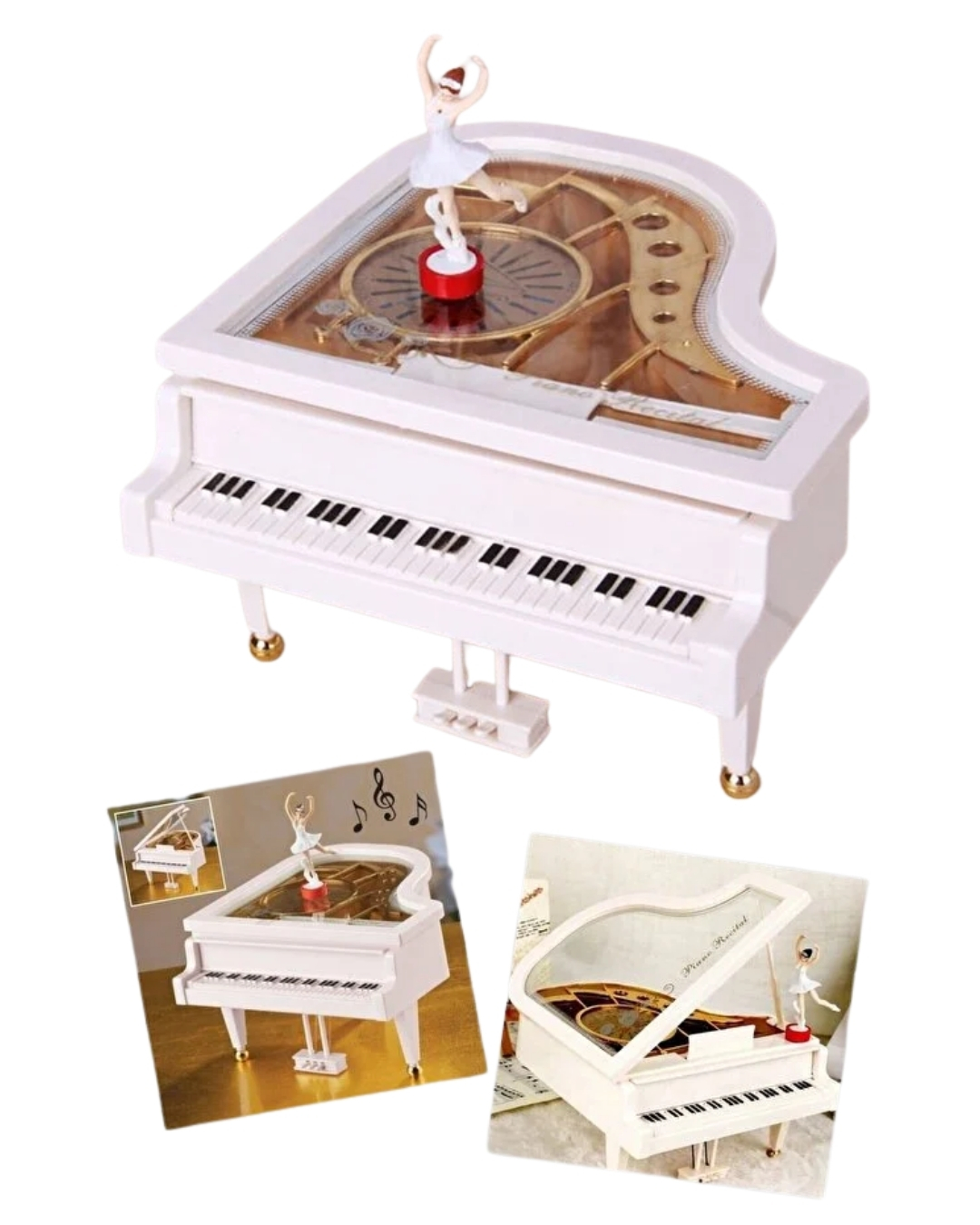 Piyano şeklindeki şık tasarımın üzerinde dönen bir balerin figürü yer alır. Kurma mekanizması sayesinde müzik çaldığında balerin zarifçe dönerek adeta büyüleyici bir atmosfer oluşturur.