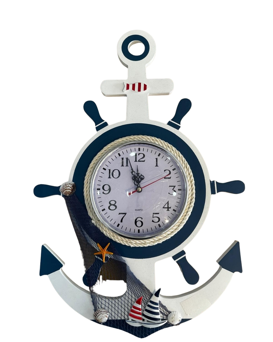 Evinize veya ofisinize deniz esintisini getirin! Bu özel tasarım marin temalı duvar saati, sadece zamanı göstermekle kalmaz, mekanın ruhunu değiştirir. Klasik çapa ve gemi dümeni formunun birleştiği bu saat; gerçek halat detayları, dekoratif balık ağı ve minyatür deniz figürleriyle (deniz yıldızı, deniz kabuğu, yelkenli) zenginleştirilmiştir.