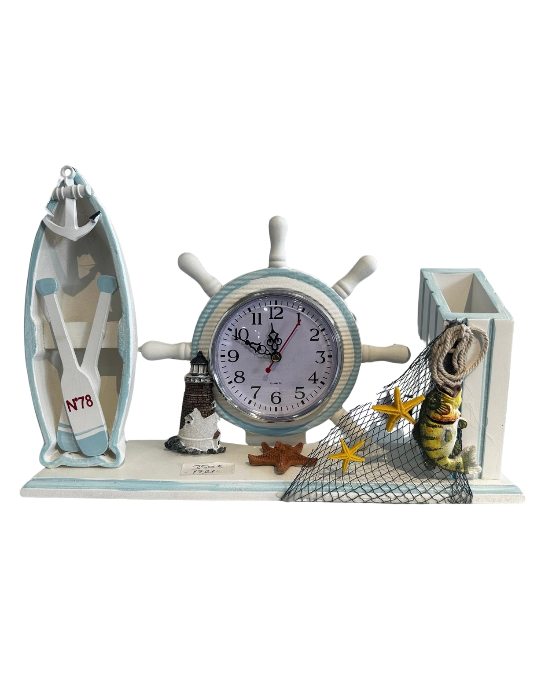 Zengin Detaylar: Gemi dümeni formundaki saat, minyatür fener, deniz yıldızı ve balık ağı detaylarıyla gerçeğe yakın bir marin atmosferi sunar.